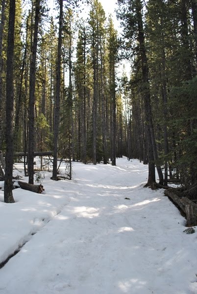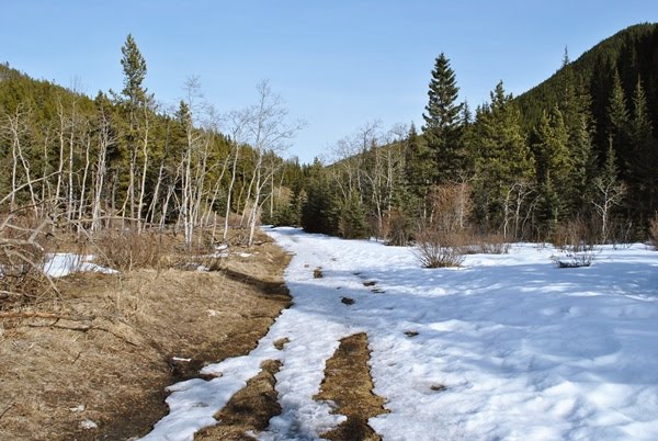 We had hiked about a third of the Prairie Creek Trail a few weeks ago and liked it so we thought we’d try the loop. The first leg is about 6 km. We were expecting it to be much shorter so it seemed longer. The sun is coming in from the south and you are on a southern slope most of this section of the walk – in the cooler weather this was nice. Most of the snow and ice was gone after the first bridge. You have good views up the valley and there are several beautiful meadows through the last leg of that leg of the hike. About 6 km in you hit Powderface Link.